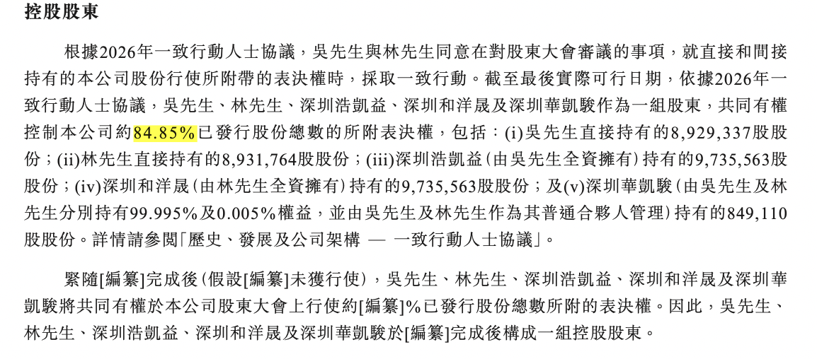 IPO前,依据2026年一致行动人士协议,吴林佺、林咏华、深圳浩凯益、深圳和洋晟及深圳华凯骏作为一组股东,共同有权控制公司约84.85%已发行股份总数的所附表决权。