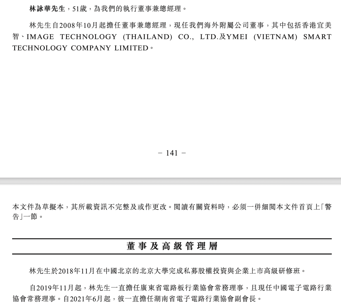 林咏华自2008年10月起担任董事兼总经理,现任公司海外附属公司董事,其中包括香港宜美智、IMAGE TECHNOLOGY (THAILAND) CO., LTD.及YMEI (VIETNAM) SMART TECHNOLOGY COMPANY LIMITED。