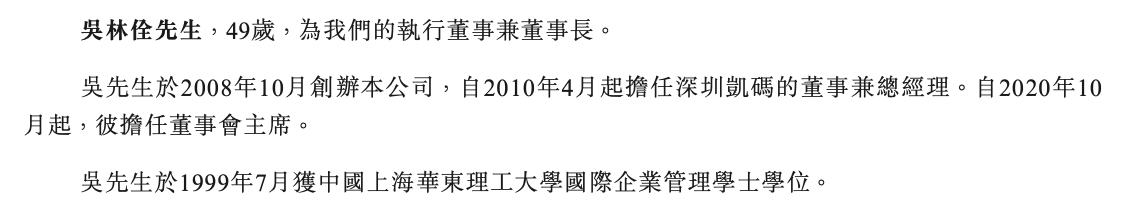 吴林佺于2008年10月创办公司,自2010年4月起担任深圳凯码的董事兼总经理。自2020年10月起,其担任董事会主席。