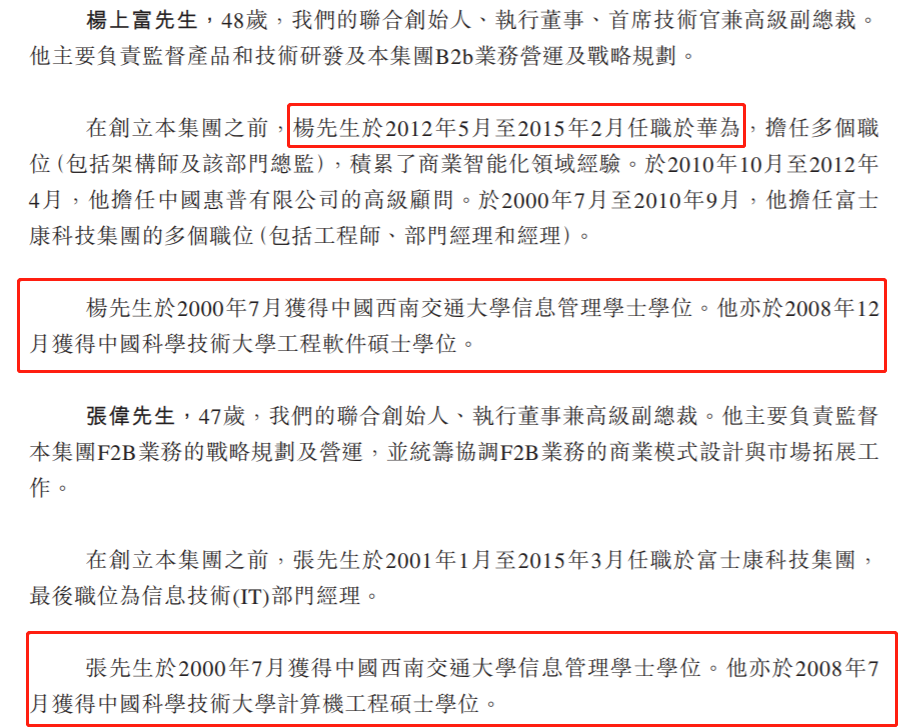 而杨上富及张伟两人本科均为西南交通大学信息管理专业,同校同专业;硕士均就读于中国科学技术大学,虽是不同专业,但两人毕业后均先后入职富士康科技集团。在杨上富从华为离职1个月之后,张伟也随之离职参与创业。
