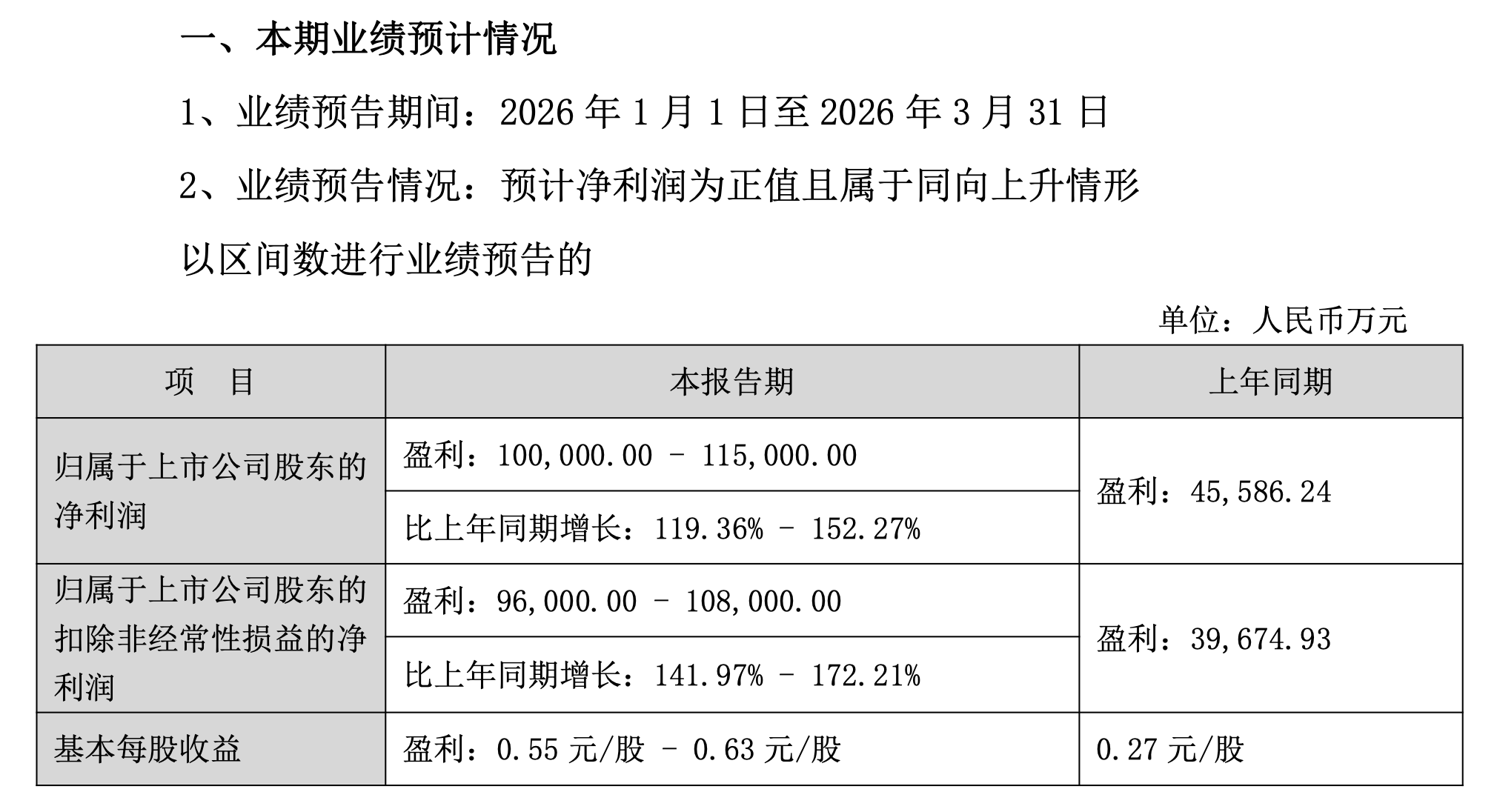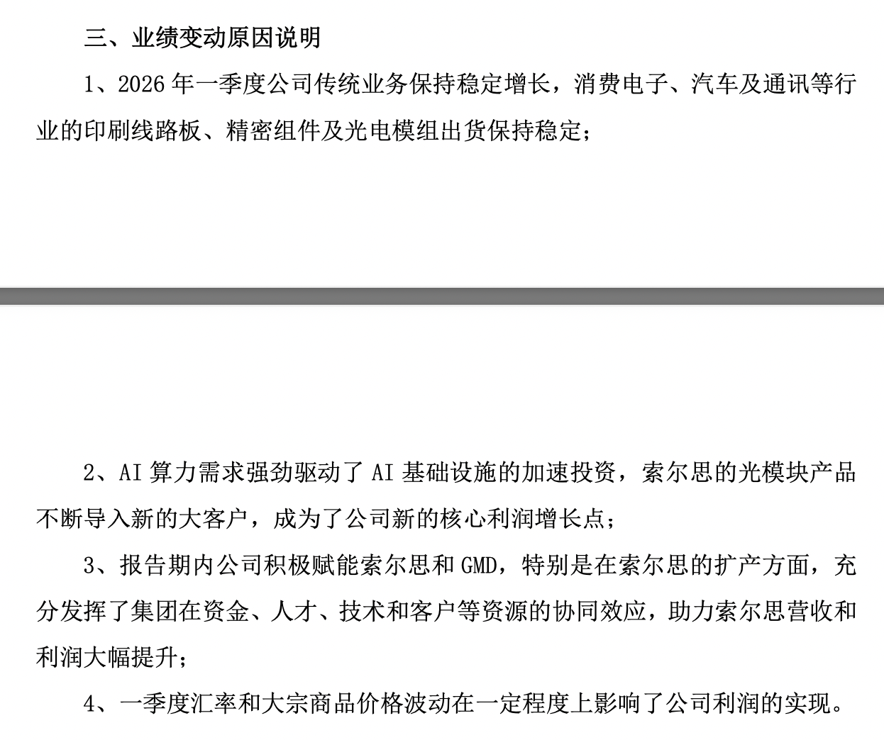 关于业绩变动,东山精密表示,2026年一季度公司传统业务保持稳定增长,消费电子、汽车及通讯等行业的印刷线路板、精密组件及光电模组出货保持稳定。