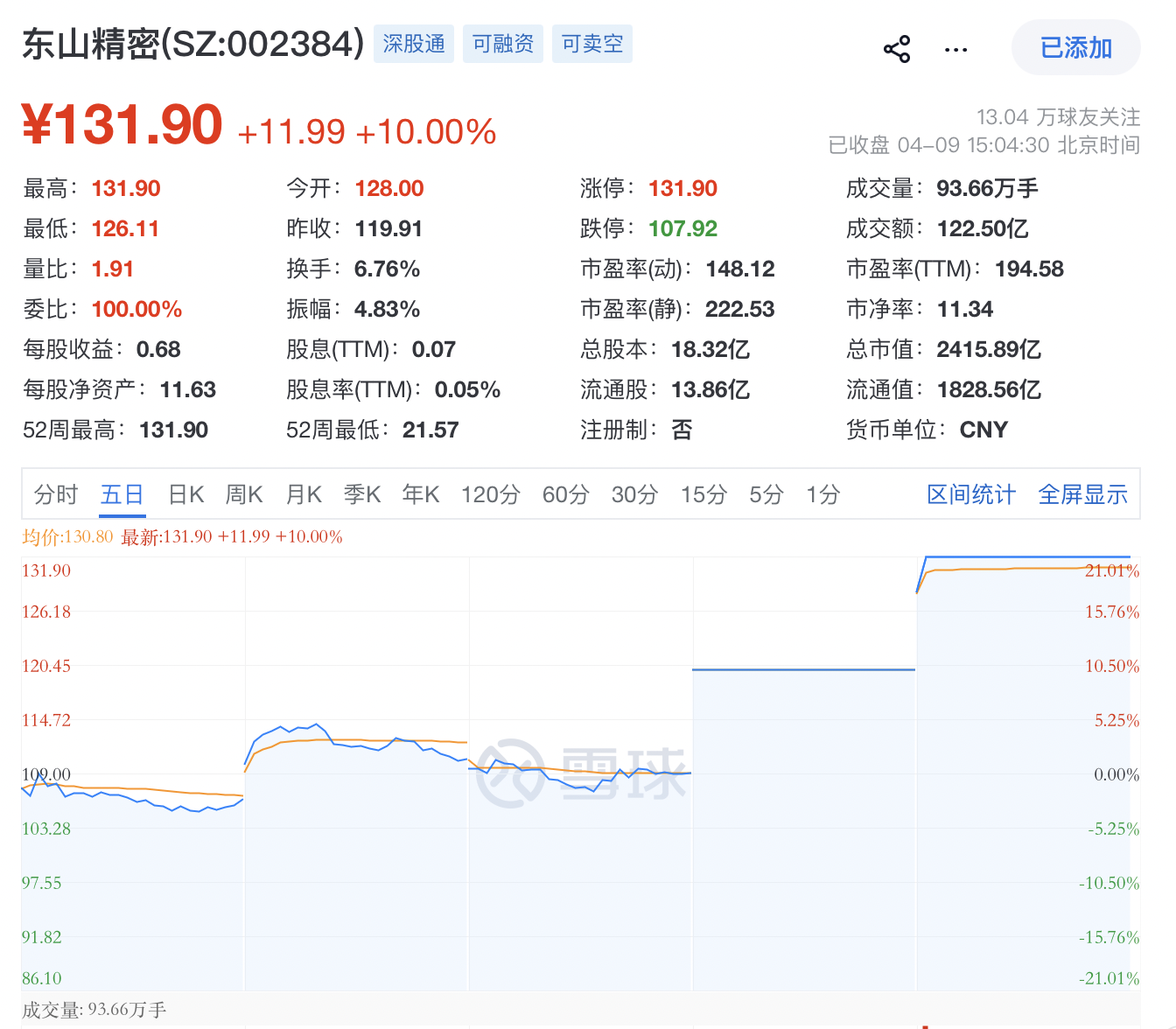瑞财经 吴文婷 4月9日,东山精密再度涨停,截至当日收盘时,其报131.9元,涨10%,总市值约2415.89亿元。其连续两个交易日涨停,晋级2连板。