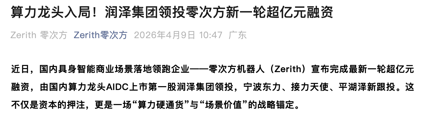 瑞财经 吴文婷 4月9日,零次方机器人(Zerith)宣布完成最新一轮超亿元融资,由国内算力龙头AIDC上市第一股润泽集团领投,宁波东力、接力天使、平湖泽新跟投。