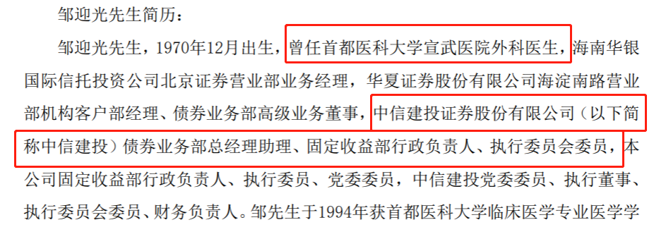 邹迎光曾任首都医科大学宣武医院外科医生,海南华银国际信托投资公司北京证券营业部业务经理,华夏证券股份有限公司海淀南路营业部机构客户部经理、债券业务部高级业务董事,中信建投债券业务部总经理助理、固定收益部行政负责人、执行委员会委员,中信证券固定收益部行政负责人、执行委员、党委委员,中信建投党委委员、执行董事、执行委员会委员、财务负责人。
