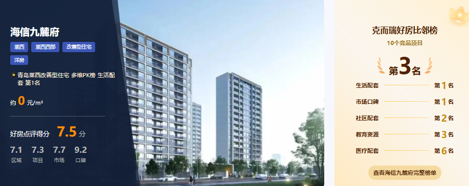 青岛克而瑞好房点评网发布了最新的“多维PK榜”。海信九麓府凭借卓越的综合表现,一举夺得莱西西部口碑榜冠军