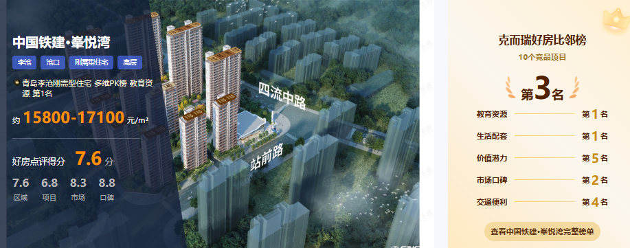 中国铁建·峯悦湾夺得青岛克而瑞好房点评网教育资源分榜冠军,并非偶然。它是名校资源、政策红利、央企品质、便捷交通多重优势叠加的结果。