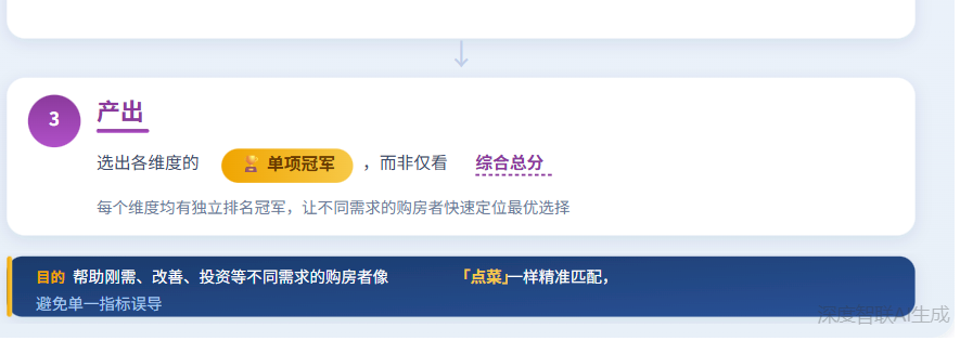 它不是全城大乱斗,而是将定位、地段、价格相近的楼盘归为一组“竞品圈”,在圈内进行公平 PK。这种机制确保了比较的公平性与直接性,让购房者能清晰看到每个项目的长板与短板。