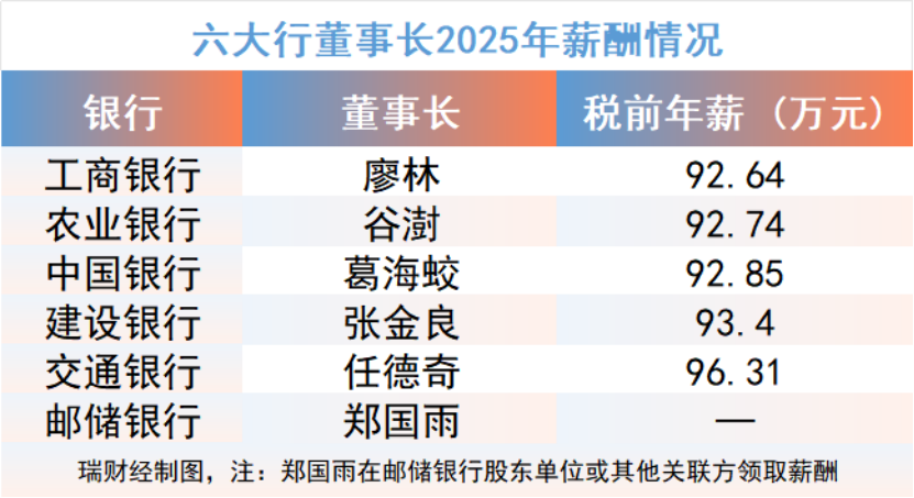 具体看,2025年,工商银行董事长廖林年薪92.64万元,农业银行董事长谷澍年薪92.74万元,中国银行葛海蛟年薪92.85万元,建设银行董事长张金良年薪93.4万元,交通银行董事长任德奇年薪96.31万元。