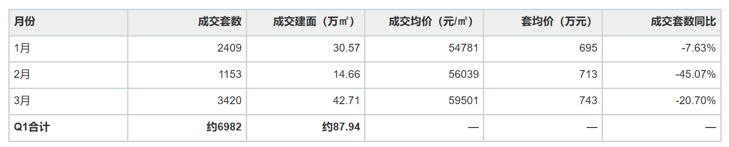 成交套数同比全线下降——1月-7.6%、2月-45.1%、3月-20.7%,一季度整体成交量较2025年同期明显缩量。