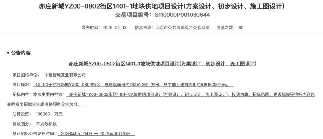 4月13日,中建智地发布一则设计招标计划,估算投资19.696亿元。它的目标很明确——亦庄新城YZ00-0802街区1401-1地块(又称“瀛海地块”)。
