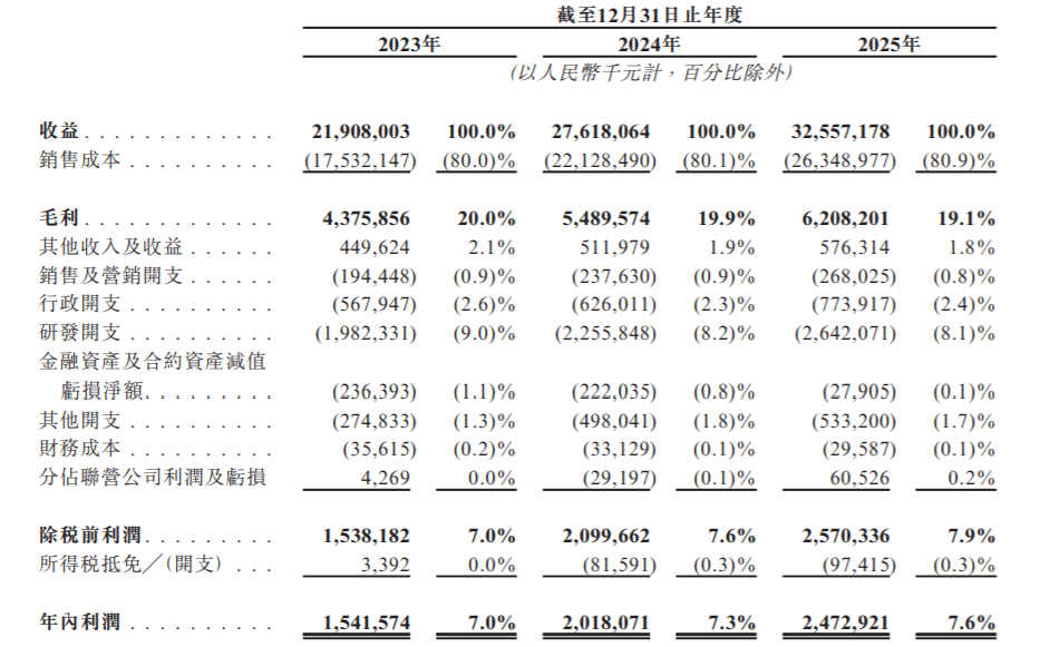 业绩方面,2023年、2024年、2025年,德赛西威营收分别为219.08亿元、276.18亿元、325.57亿元;年内利润分别为15.42亿元、20.18亿元、24.73亿元;毛利率分别为20%、19.9%、19.1%,连续两年下滑。