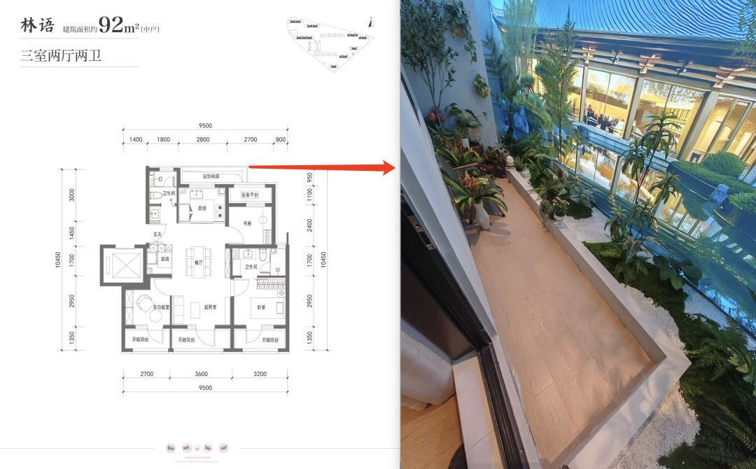 其次,他在产品上敢于突破,那个“装饰构架”改出来的北向阳台,虽然只有4㎡,但能在新盘得房率普遍超90%的局面下再出花活,把“好房子”政策用到了极致。