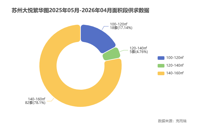 从上述图表可以看出,140-160平方米的面积段是绝对的成交主力,占比高达78.1%,共成交82套。这一数据清晰地表明,大 悦繁华图的核心客群并非刚需首置,而是追求居住品质改善的家庭。与此同时,100-120平方米户型也贡献了18套的成交,显示出项目在产品跨度上兼顾了部分进阶型刚需客户的需求。