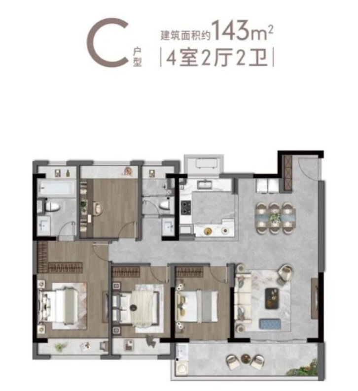 143-169平方米四房:针对多代同堂或追求更大空间的家庭,设计了四开间朝南、双联阳台、套房主卧等亮点,极大提升了居 住的舒适度和私密性。