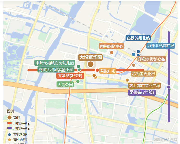 从位置图可以看出,大悦繁华图周边的配套设施已经相当成熟。交通方面,项目距离地铁2号线大湾站仅约637米,步行即可 到达;一站地铁即可抵达高铁苏州北站,轻松实现长三角城市间的快速通勤。商业方面,项目周边环绕着吾悦广场、圆融购物中心、大悦春风里等大型商业综合体,以及芯光里、美好荟等社区商业,满足了居民从日常购物到休闲娱乐的全方位需求。这种“出门即繁华”的生活场景,极大地提升了居住的便利性和幸福感。