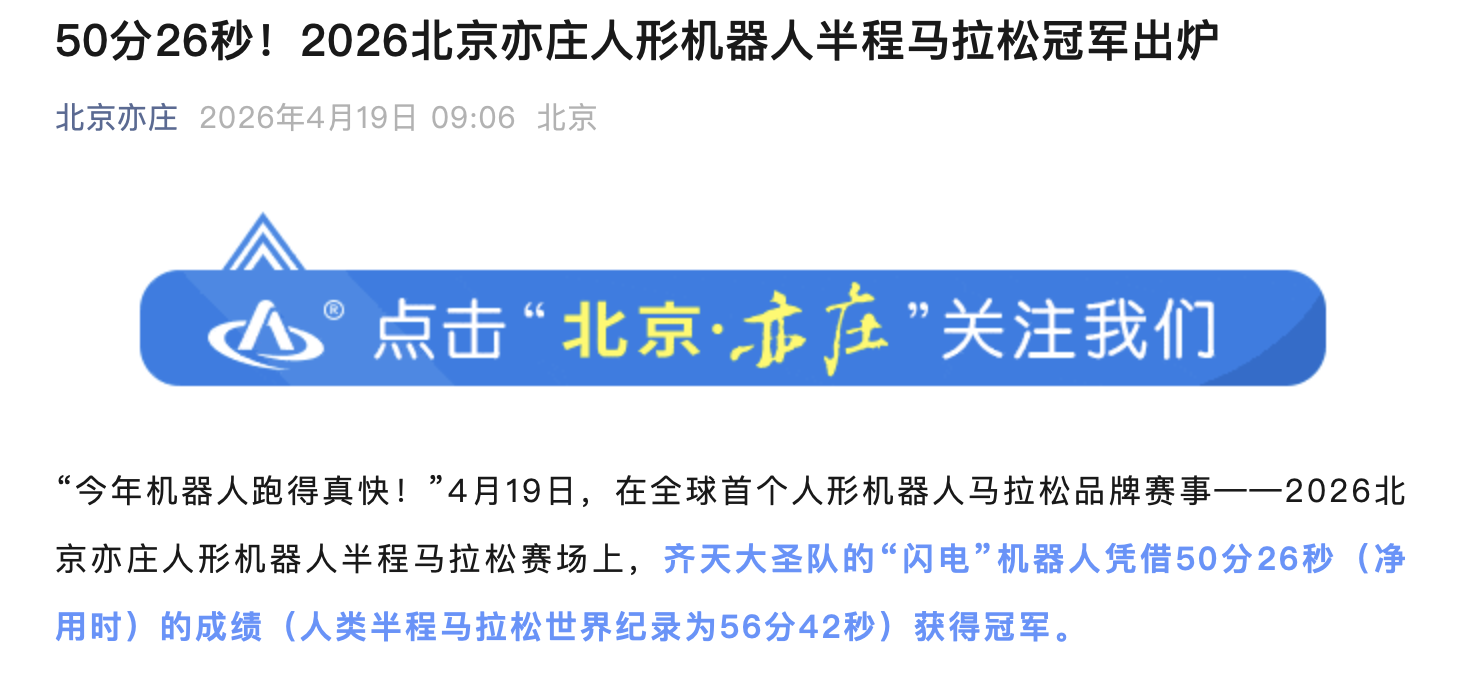 4月19日,2026人形机器人半程马拉松鸣枪开跑。其中,齐天大圣队的荣耀机器人“闪电”凭借50分26秒(净用时)的成绩(人类半程马拉松世界纪录为56分42秒)获得冠军。