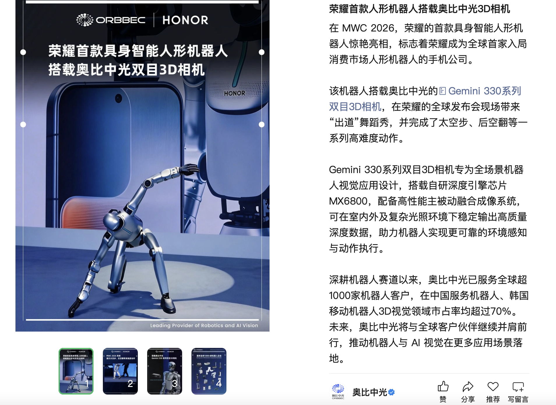 此前3月9日,奥比中光发文称,荣耀首款人形机器人搭载奥比中光3D相机。