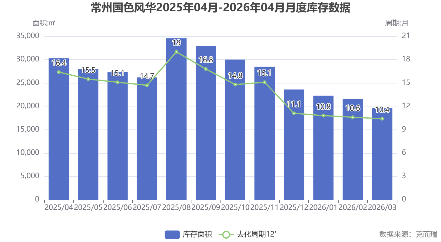 数据解读:根据克而瑞数据,国色风华库存建面从2025年4月的3万余平方米降至2026年3月的1.9万余平方米,去化周期稳定在10-16个月之间,显示项目去化流畅,市场供需关系健康。