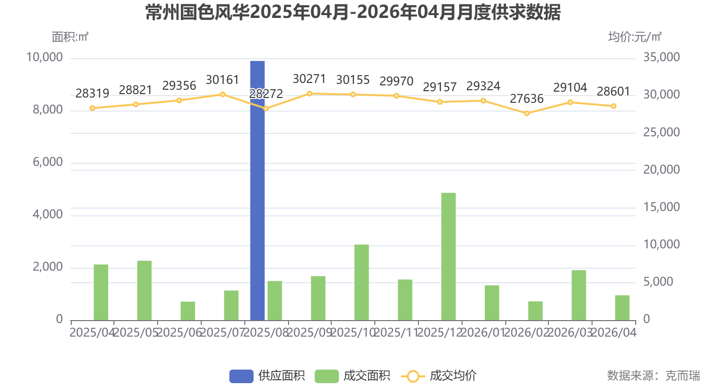 从国色风华2025年4月至2026年4月的月度供求数据来看,项目在过去一年中保持了稳定的供应与成交节奏。特别是在2025年12月,成交建面达到4860平方米,成交套数27套,显示出年底市场的强劲需求。尽管市场波动,项目的成交均价始终维持在29000-30000元/㎡的高位区间,体现了极强的价格韧性。