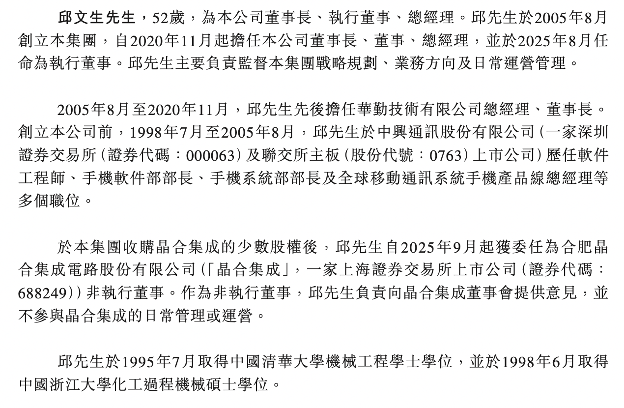 于集团收购晶合集成的少数股权后,邱文生自2025年9月起获委任为合肥晶合集成电路股份有限公司非执行董事。作为非执行董事,邱文生负责向晶合集成董事会提供意见,并不参与晶合集成的日常管理或运营。