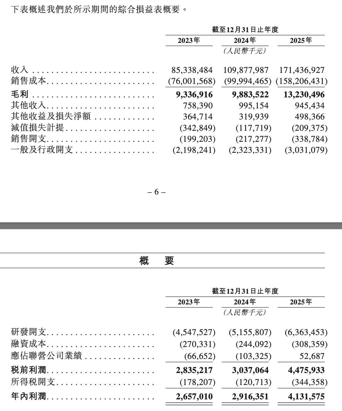 据招股书,2023年-2025年,华勤技术实现收入分别为853.38亿元、1098.78亿元、1714.37亿元;年内利润分别为26.57亿元、29.16亿元、41.32亿元。