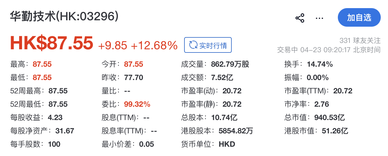 乐居财经 吴文婷 4月23日,华勤技术(03296.HK)在港交所挂牌上市,中金公司、美银证券为联席保荐人。其开盘报87.55港元,涨12.68%,总市值约940.53亿港元。