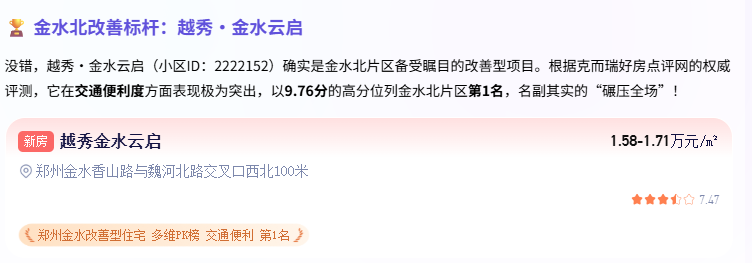 除了交通,项目在医疗评测(9.75分,片区第1)、教育评测(9.51分,片区第2) 以及区域价值(8.16分,片区第1) 等方面同样表现优异,是金水北名副其实的“六边形战士”。