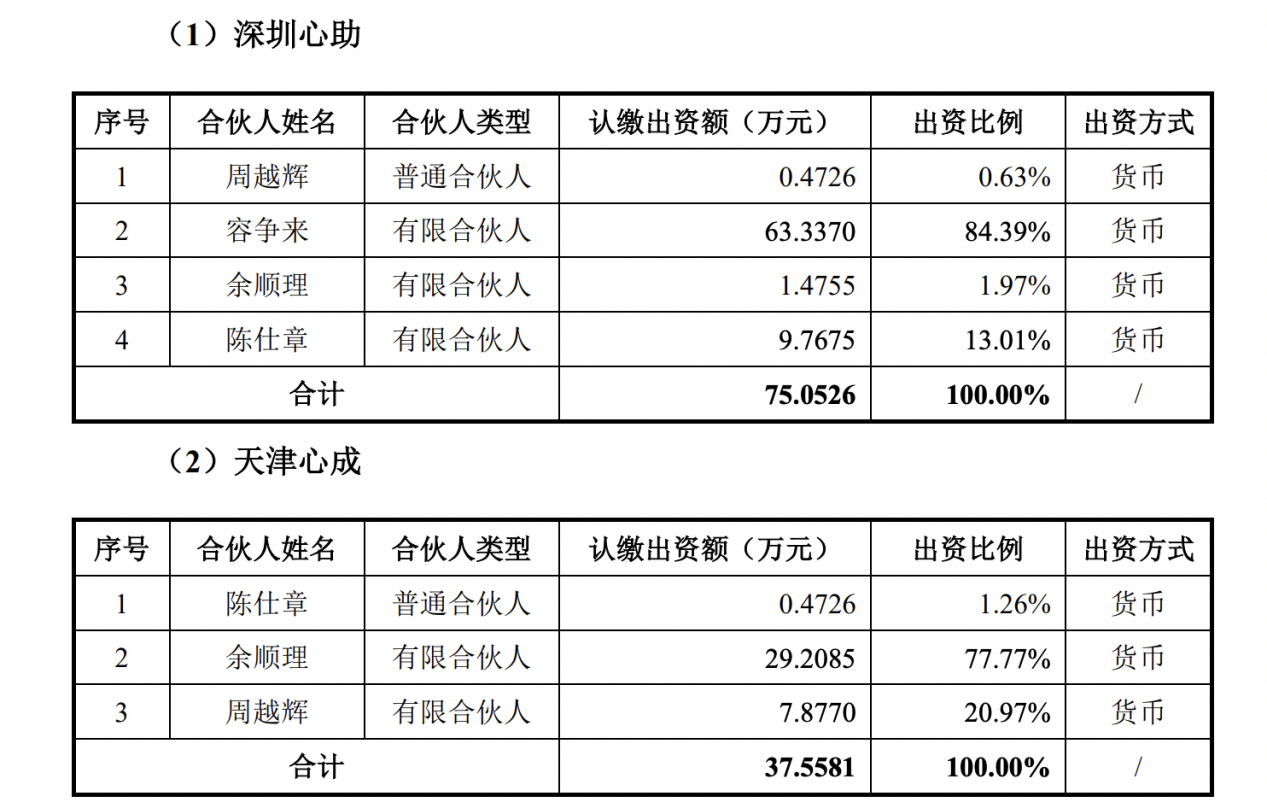 除深圳心辅外,核心医疗还有深圳心助、天津心成两个员工持股平台,分别持股2.62%和1.31%的,余顺周之弟余顺理(现任核心医疗行政总监)作为有限合伙人分别持有深圳心辅6.85%份额、深圳心助1.97%份额、天津心成77.77%份额,余顺理与余顺周为一致行动人,余顺理曾代余顺周持有核心医疗股份。