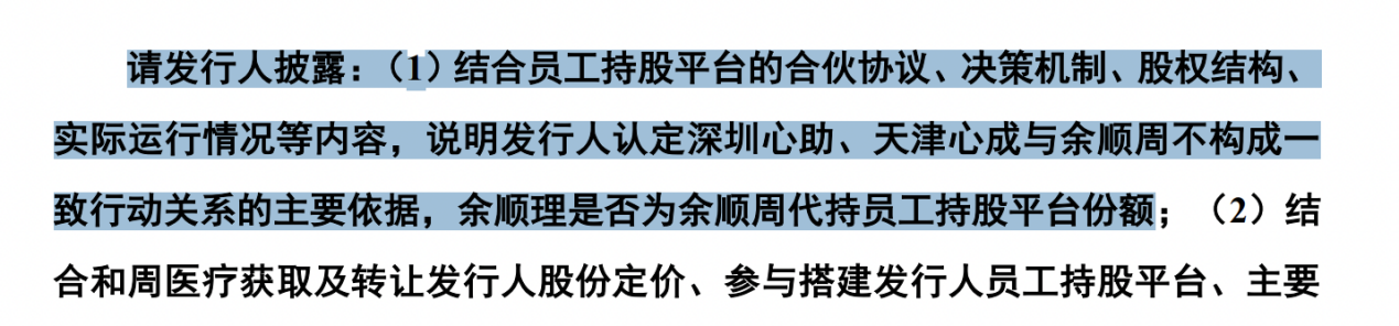 对此,上交所要求核心医疗披露:结合员工持股平台的合伙协议、决策机制、股权结构、实际运行情况等内容,说明公司认定深圳心助、天津心成与余顺周不构成一致行动关系的主要依据,余顺理是否为余顺周代持员工持股平台份额。