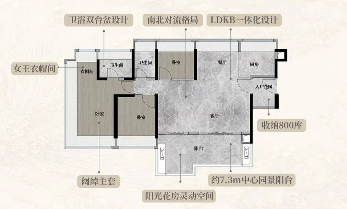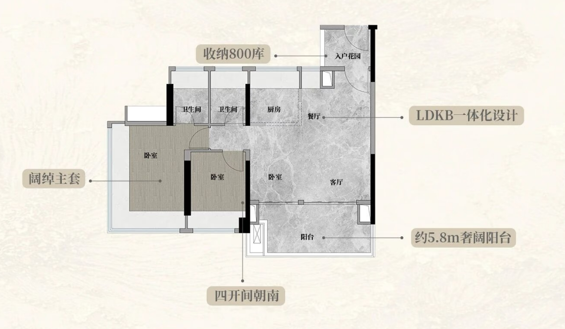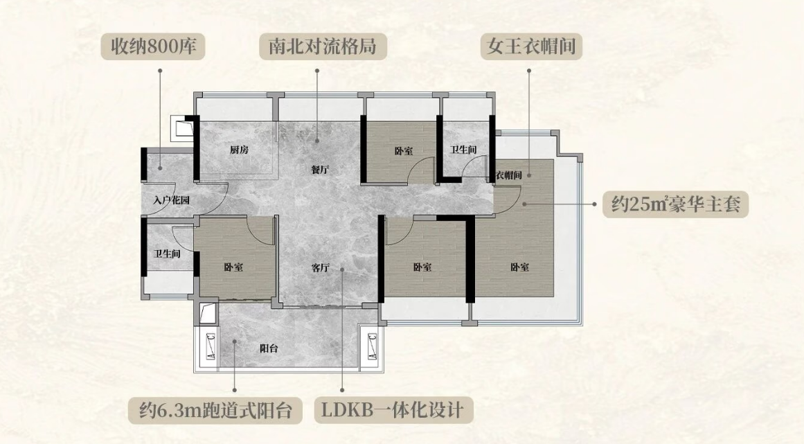 ·建面约112㎡户型为四房两卫,做到了南北对流双阳台,在同等面积段里,这种双阳台的配置在市场中比较少见。