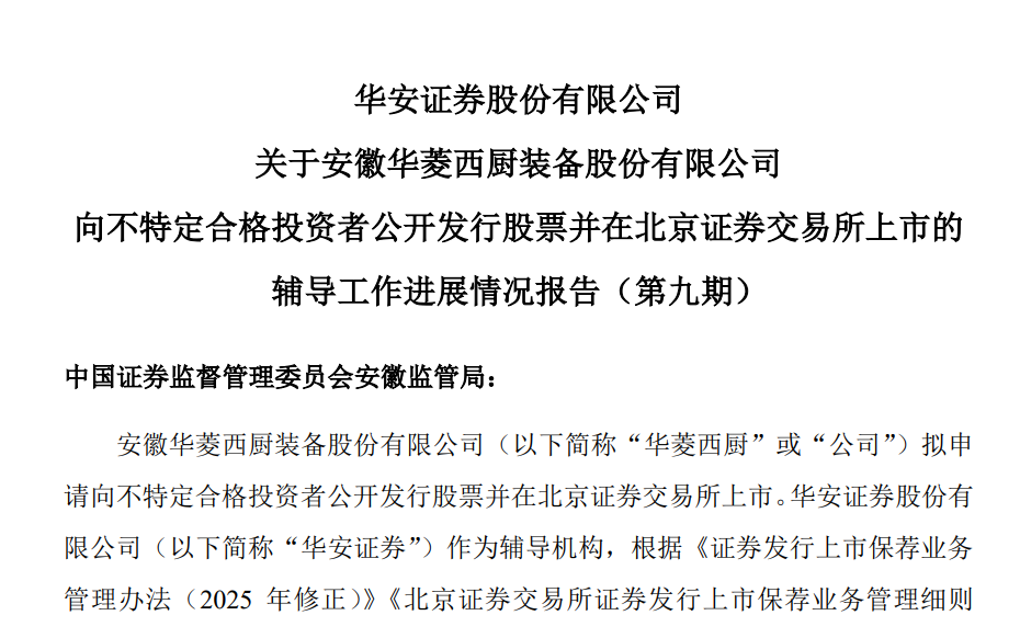 乐居财经 李兰 前不久,安徽华菱西厨装备股份有限公司(以下简称:华菱西厨)披露向不特定合格投资者公开发行股票并在北交所上市的辅导工作进展情况报告(第九期)。辅导机构为华安证券股份有限公司。