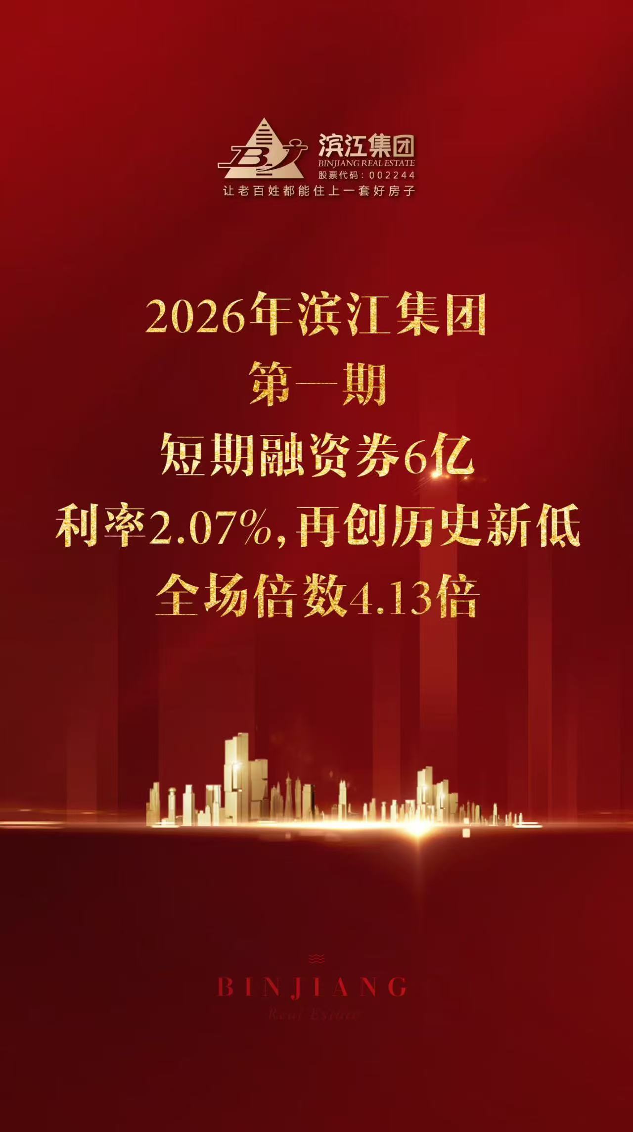乐居财经 吴文婷 4月28日消息,滨江集团成功发行2026年第一期短期融资券,规模为6亿元,利率2.07%,再创历史新低,全场倍数4.13倍。