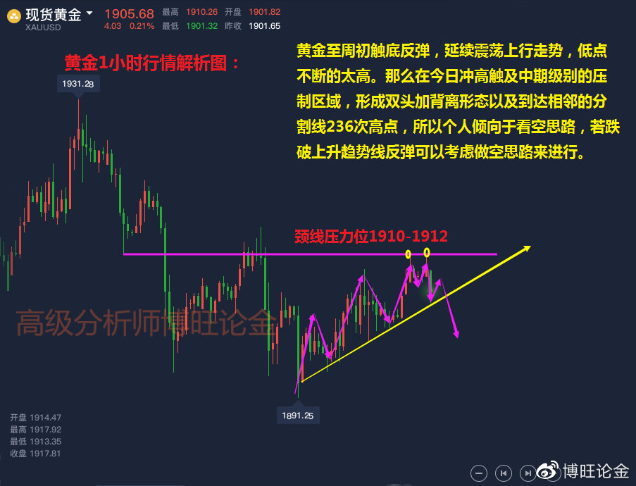 综合来看周一黄金博旺建议,以反弹为空为主,回踩做多为辅,短线上方关注1910-1913一线压力,下方关注短线1894-1890一线支撑。行情千变万化具体操作还请及时与我沟通。