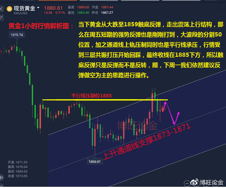 黄金本周在连续下行之后周五跌幅开始放缓,反抽修正的力度逐步加大,这说明低位出现买盘,同时获利盘也有所了结。那么下方目前可以看到的支撑位置在前期起涨点1848,这也是这一波上升关键的支撑位置,如果守住还有机会拉起来,要是跌破下方,大级别修正的空间还会释放。短线方面暂时先不用看那么远,注意走势形态顺势做跟进,盘整之后向上反抽,目前价格最高反弹到了相应的关键压力位1890附近,当行情触及此位置后价格瞬间回踩,这意味着力度有所消退,所以下周我们围绕震荡修复。综合来看周一黄金(博旺论金)建议——以反弹做空为主-回踩做多为辅。短线上方关注1885-1888一线压力,下方短周期关注1873-1871一线支撑。若强势打破下方支撑,再关注1867-1866关键次低点。