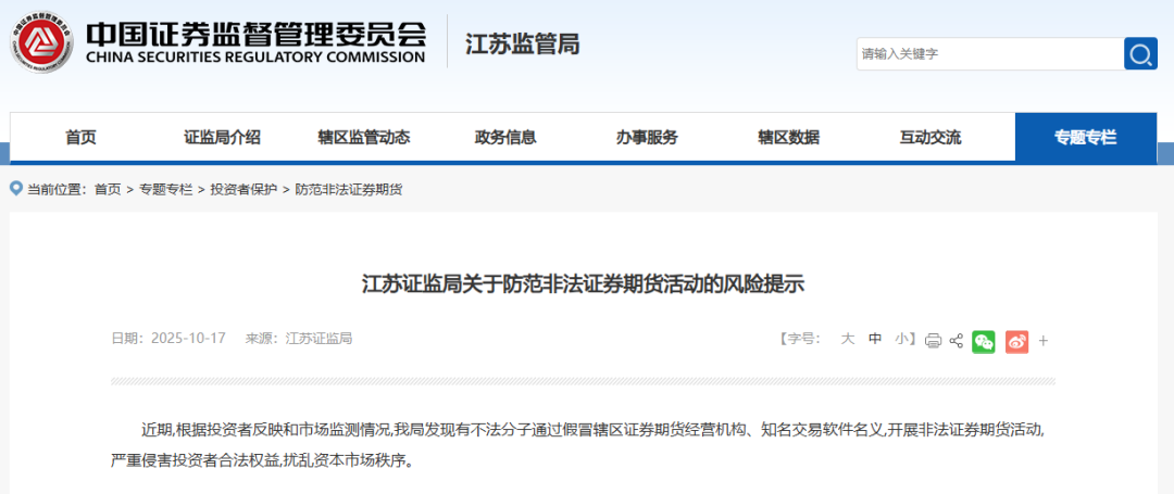 10月17日,江苏证监局发布关于防范非法证券期货活动的风险提示。