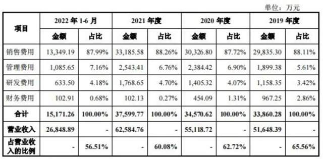 各期销售费用率分别为 57.77%、55.02%、53.03% 及 49.72%,远高于同行可比公司销售费用率均值的 50.74%、47.42%、47.16%、43.79%。