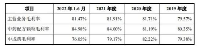 尽管中药配方颗粒的毛利率逐年上升,期内分别为 80.35%、81.19%、84% 及 84.94%。但增速不及中成药降速,最终导致主营业务毛利率连续两年上涨后,在 2022 上半年出现下降,为81.47%,较 2021 年下降 0.44 个百分点。