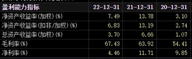 毛利率虽从2021年的63.92%升到2022年的67.43%,净利率却从11.71%大降到2022年的4.46%,足足减超7个百分点。
