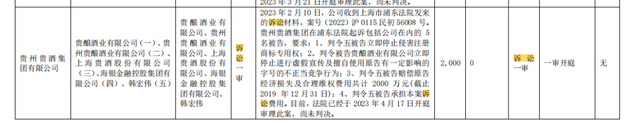 2022年报披露了最新情况:贵州贵酒仍锲而不舍,最新诉讼将经济损失及维权费用提升到2000万。目前2023年4月17日完成开庭审理,尚未判决。