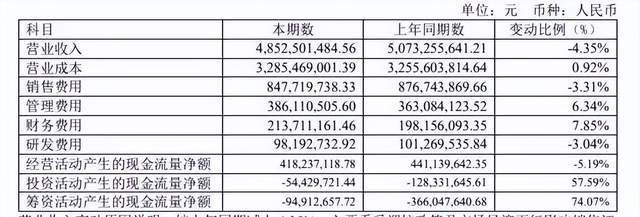 经营活动现金流净额4.18亿元,同比下降5.19%;总成本15.46亿元,增加648.05万元;其中,管理费同比增长6.34%,研发费下降3.04%,财务费增长7.85%。