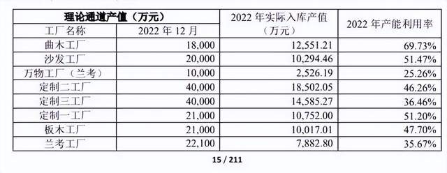 不算多苛求。查阅曲美家居年报,其国内共有两大生产基地在内的八个生产工厂,2022年产能利用率最高的曲木工厂,也仅为69.73%。沙发工厂、定制一厂超过50%,其余均不足50%。其中,兰考工厂产量利用率只有35.67%。在此背景下,仍欲豪投3.5亿建二期项目,是否过于乐观乃至激进了,一旦去化不利衍生风险知多少、募资多少严谨性呢?