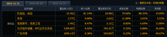 2022年,皇氏集团光伏相关业务毛利率36.69%,仅次于广告传媒业务,远高于传统主业乳制品、食品。可同期贡献营收只有1209.05万元,仅占总营收0.42%。