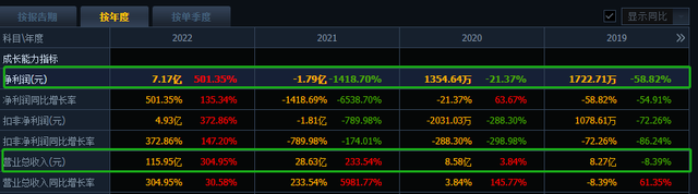 同期归母净利1722.71万元、1354.64万元、-1.79亿元、7.17亿元,对应增速-58.82%、-21.37%、-1418.70%、501.35%。