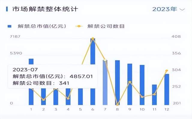 据东方财富数据,7月17日至7月21日,A股上市公司单周解禁市值为929.34亿,连续三周解禁市值超900亿。本月将有341家上市公司解禁,涉及市值或超4800亿。
