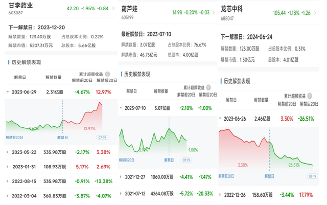 另一厢,甘李药业、葫芦娃虽也迎大额解禁,由于前者股东减持温和、后者暂无股东宣布减持,股价走势较为平稳。20日累计超额收益葫芦娃微跌1%,甘李药业还上涨了12.97%。