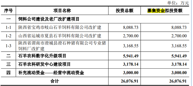 聚焦此番IPO,公司计划募资2.61亿元。其中,8088万元用于陕西省宝鸡市岐山石羊饲料有限公司改扩建、2700万元用于山西省运城市夏县石羊饲料有限公司改扩建、3168万元用于陕西省渭南市澄城县澄石种猪有限公司专业猪 饲料厂改扩建、5941万元用于石羊农科数字化升级项目、3178万元用于石羊农科研发中心建设项目、3000万元用于补充流动资金——经营中流动资金。