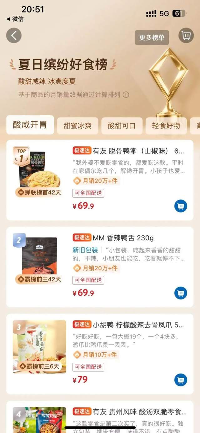该渠道正是山姆等会员制超市。早在2024年7月,有友就开始向山姆特贡脱骨鸭掌。据山姆APP显示,该产品主打“0添加防腐剂和色素、减盐25%”,在健康理念上契合了现代消费者的需求。截至2025年7月 30 日21时,该产品已登上夏日开胃榜TOP1,月销量突破20万件。显示了产品创新的认可度,新渠道的开拓威力。