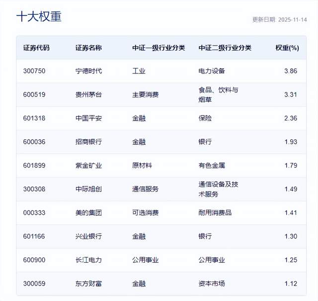 (来源中证指数官网,截至2025年11月14日。注:个股仅为成分股展示,不作为个股推荐。)