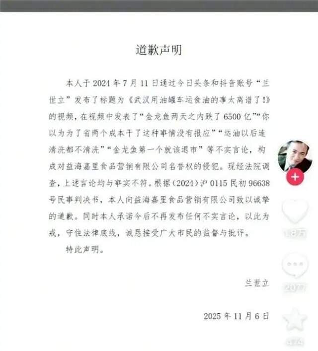 据中国新闻周刊,11月11日,兰世立在其抖音账号中发布了一则道歉声明,遵照相关生效民事判决向益海嘉里公司道歉。