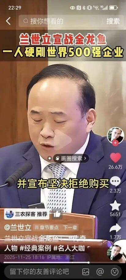 也是11月25日,兰世立发布宣战金龙鱼的视频,强硬表示要用一切手段,挖掘金龙鱼进入中国后的所作所为、以及用油罐车装载食用油的更多事实,并坚决不买金龙鱼产品并号召亲朋亲属及粉丝不买其产品。